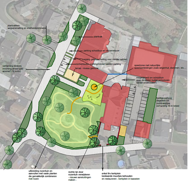 Het traject ging van start met een overlegmoment tussen de kerkfabriek en RLKM. Tijdens dit overleg werden noden, verwachtingen en kansen in kaart gebracht. Op basis van deze input startte de landschapsarchitecte van het Regionaal Landschap Kempen en Maasland met de opmaak van een voorontwerp voor de herinrichting en ontharding van de betrokken site.